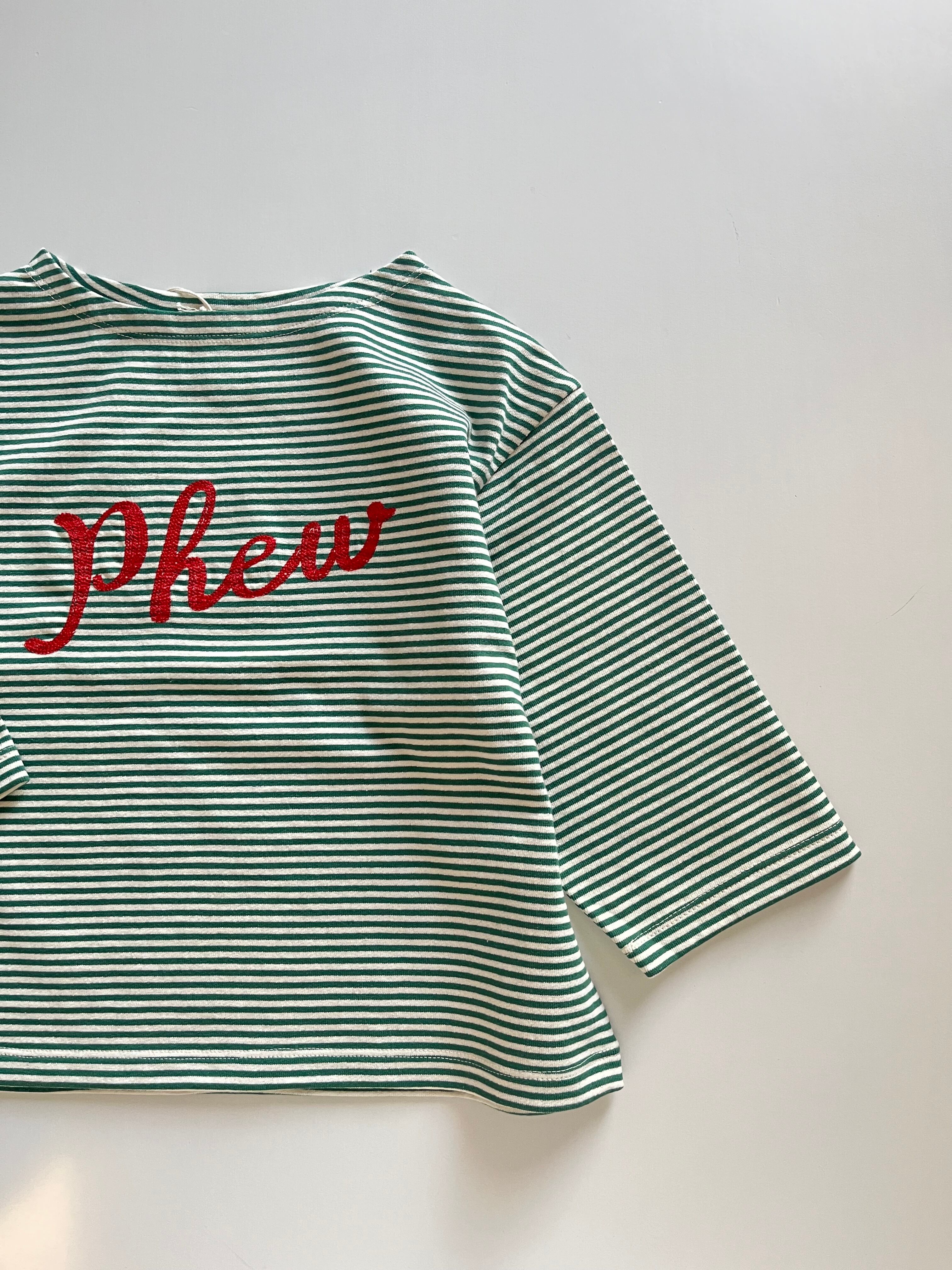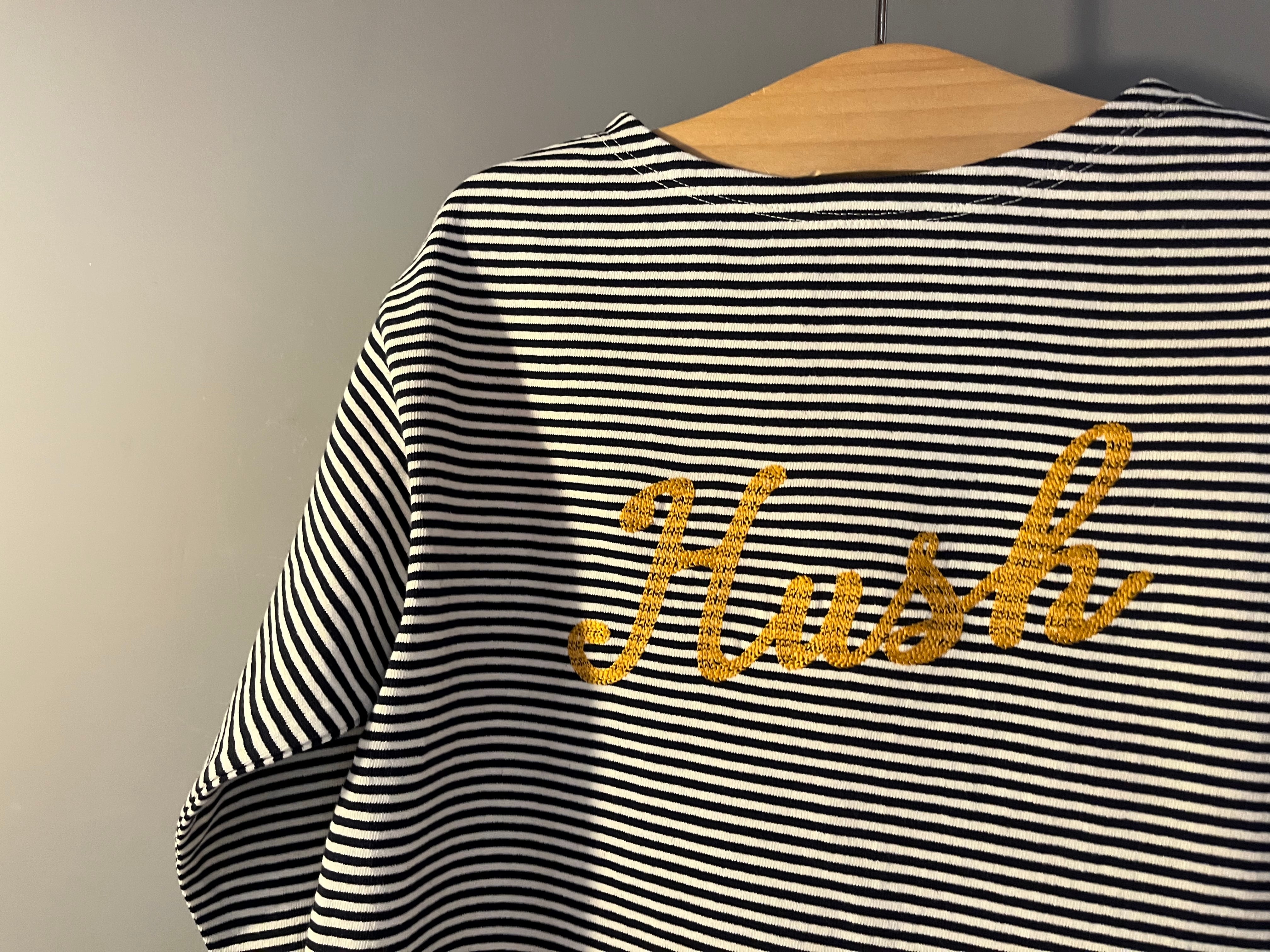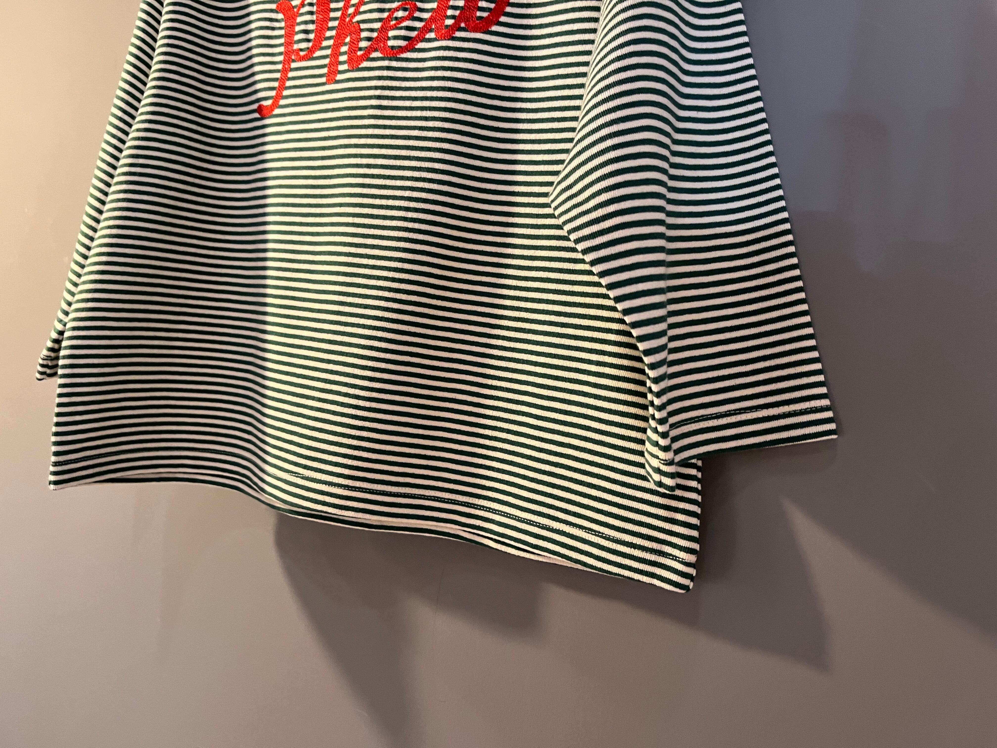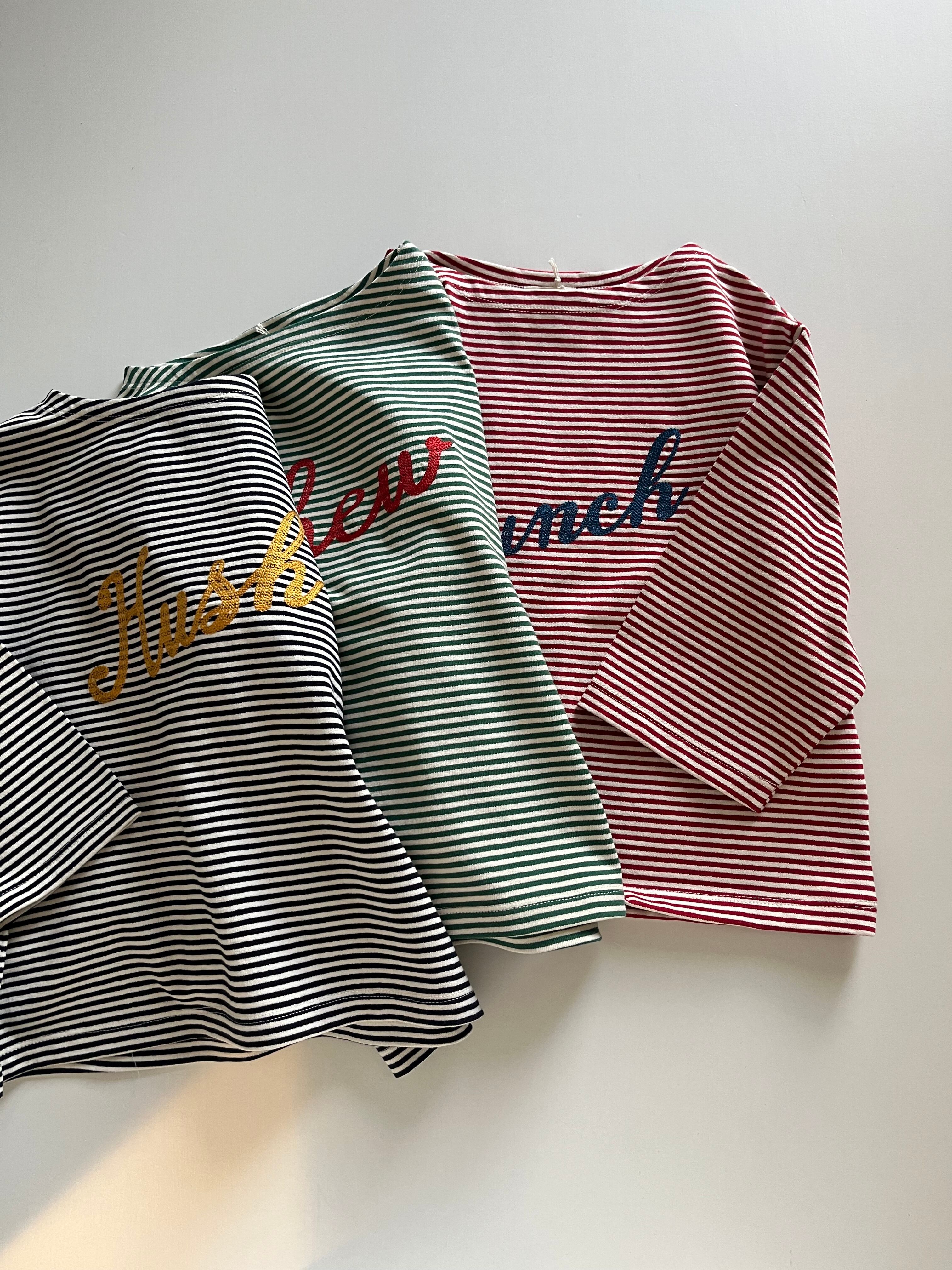 細ボーダーに刺繍の文字が入ってます。